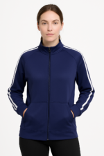 يتميز بـ front zipper, side pockets, and classic two-stripe detailing for an athletic touch.